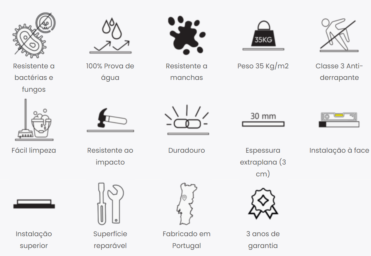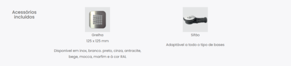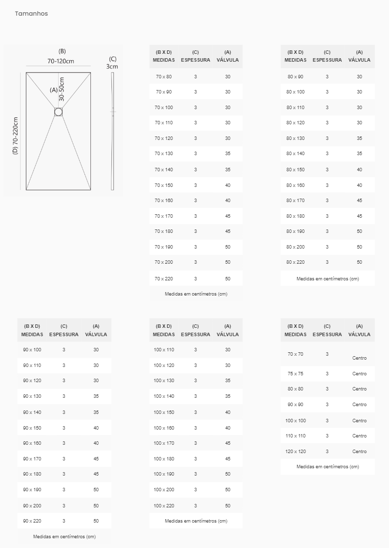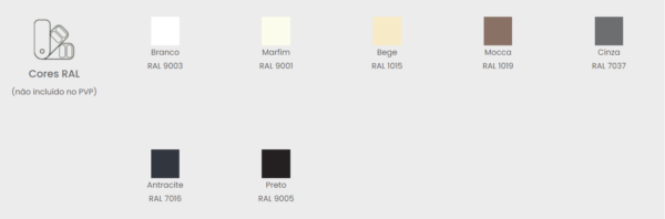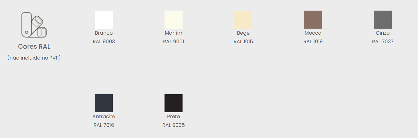 Cor | Branco, Marfim, Bege, Mocca, Cinza, Antracite, Preto |